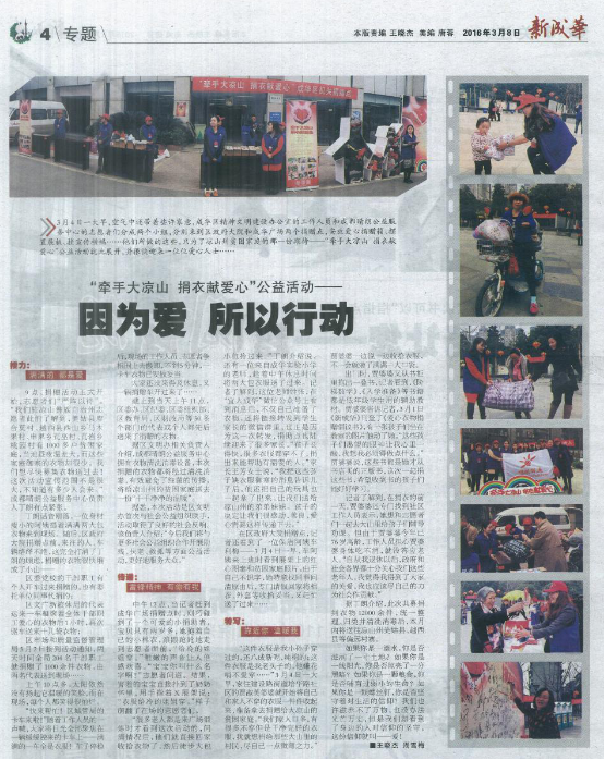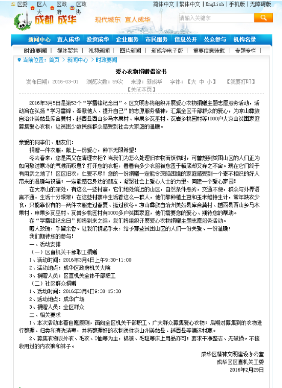 2016年 3月 5日是第 53个“学雷锋纪念日”。成华区文明办将组织开展爱心衣物捐赠主题志愿服务活动,活动旨在弘扬“学习雷锋、奉献他人、提升自己”的志愿服务精 神,汇集全区干部群众的爱心,为凉山彝族自治州美姑县库合莫村、越西县西山乡马 木果村、申果乡瓦巫村、瓦岩乡桃园村等 1000户大凉山贫困家庭募集爱心衣物,让贫困少数民族群众感受到社会大家庭的温暖。